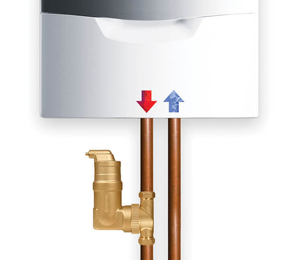 SpiroVent Entlüfter werden vorzugsweise an der heißesten Stelle im System installiert, und zwar dort, wo das Wasser den Heizkessel verlässt. Bei einer Kühlanlage ist das die Stelle, wo das Wasser in den Rücklauf vor der Kühlmaschine eintritt.